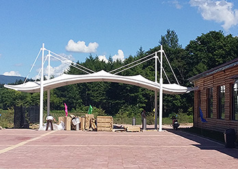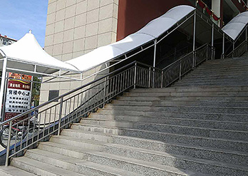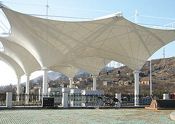 出入口膜结构打破了纯直线建筑风格的模式,以其独有的优美曲面造型,简洁、明快、刚与柔、力与美的完美组合,呈现给人以耳目一新的感觉,同时给建筑设计师提供了更大的想象和创造空间