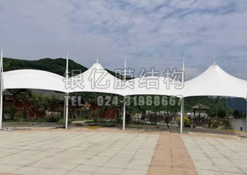景观膜结构罩棚使用寿命长,不同的膜材使用寿命从10年到30年不等,施工工期短,由于膜结构顶棚是工厂加工后直接现场安装,所以在造价以及施工速度方面有着明显的优势