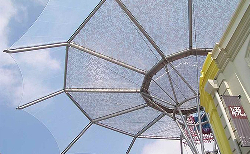 ETFE膜的出现为现代建筑提供了一个创新解决方案。由这种膜材料制成的屋面和墙体质量轻,只有同等大小的玻璃质量的1%;韧性好、抗拉强度高、不易被撕裂,延展性大于400%;耐候性和耐化学腐蚀性强,熔融温度高达200℃,并且不会自燃。