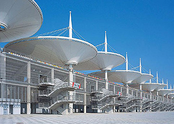 膜结构主席台改善了早期钢筋混凝土结构给人带来的单一笨重的感觉,配合着铝塑板造型的多样化也慢慢映入人们眼帘